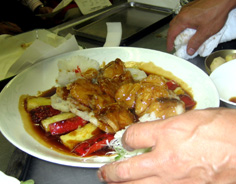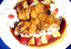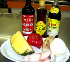 材料 4人分 白身魚(今回は銀たら使用) 250g位 レンコン 80g 赤ピーマン 1/2個 パイナップル 1/4個(缶詰でもOK) 魚の下味 塩少々 紹興酒 大さじ1 コショウ少々 揚げ油 衣用の片栗粉を多めに用意 タレのあわせ調味料 中国黒酢 120cc 砂糖 大さじ8 醤油 大さじ2 スープ 150cc トロミ用 片栗粉大さじ2強と水大さじ4を混ぜておく 仕上げのゴマ油 大さじ1 飾りの大根 5cm位 |