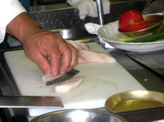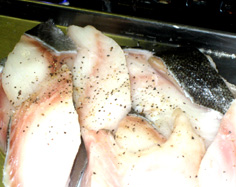 魚は水気をふき取り、骨を除く。斜めに4〜5等分位に切る。皮にも旨みがあるので付けたまま |