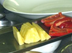 パイナップルもピーマンと同じ位のサイズに。缶詰なら輪切りを3等分 |