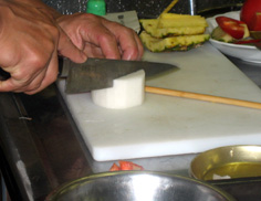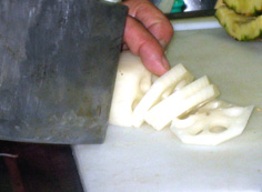 飾りの大根は皮をむいてから、縦、横に細かい切れ目を入れるが、下まで切り落とさない。このように箸などを横において切ると失敗しない |