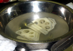 レンコンは皮をむき、5〜6ミリ |