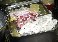 片栗粉をたっぷり用意して、魚と野菜にまぶす。れんこんは水気を良くふき取ってから |