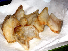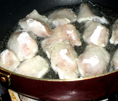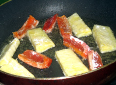 2cm程の油を熱し、焦がさないように魚を揚げて行く |