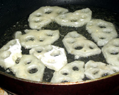れんこんは歯ざわりが残る位に白く揚げる。野菜類は、表面に火が通ったら良い |