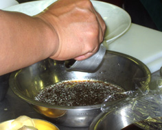濃い目の塩水に、切れ目を下にして入れておく。しんなりさせると後で綺麗な菊の花のように開く |