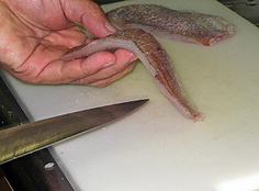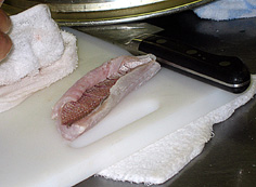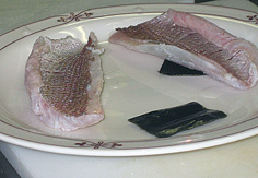 小鯛に薄塩をふり5分ほどおいてから、さっと湯通しして水におとす。冷ましてから水気をふく |