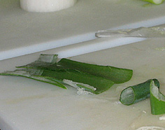 青いところは中のぬめりを取り、小口から薄切り。白いところと一緒に水にさらしておく |