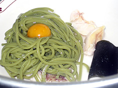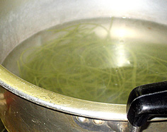 茶そばをゆでる。乾麺なのでビックリ水を3回ほどする |