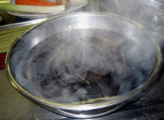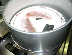 昆布を敷き、湯通しした小鯛をのせ、酒を振りかける |