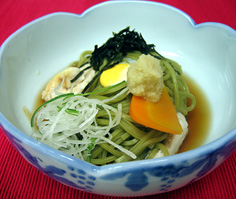 材料 4人分 小鯛の片身 4切れ 茶そば 100g ねぎ 1/2本 うずらの玉子 4個 酒 少々 おろしショウガ 少々 昆布(5cm) 4枚 切りのり 少々 タレ 出し汁(昆布・かつお) 350cc 醤油 50cc みりん 50cc |