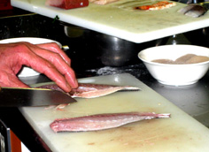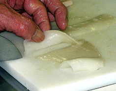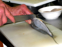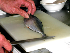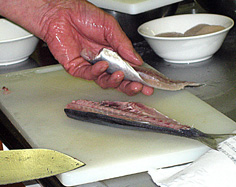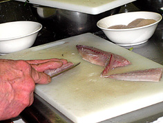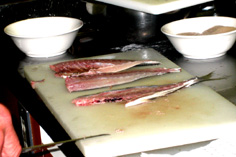 腹骨をすき取り、軽く酢洗いをして皮を取る。 |