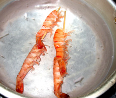 海老は尾の先を斜めに切り、腹側に竹串を刺す。これは2本一緒に刺したところ |