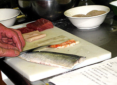 海老は腹側から一枚に開く。〆さばは尾の方から斜めに薄く切る |