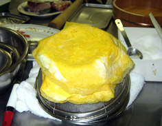 玉子を良く溶き、塩少々と水溶き片栗粉小さじ1を混ぜて、薄焼き玉子を作る。伏せたザルなどに被せるようにしておくと熱がこもらない。 その後で細く切る |