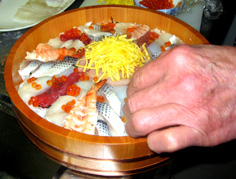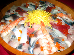 寿司飯を盛り、細く切った海苔を散らし、寿司種を並べて行く。薄焼き玉子をのせイクラを散らす |