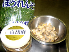 材料 4人分 ほうれん草 1把(春菊なら2把) ボイルあさり 50g 和え衣 白煎りゴマ 大さじ1 酒 少々 醤油 少々 好みで砂糖少々 |