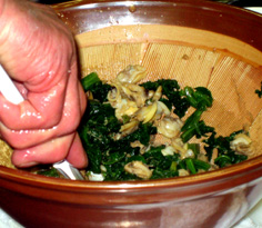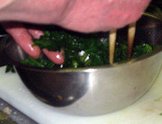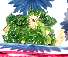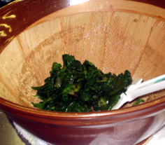 ほうれん草は塩を入れたタップリのお湯で茹でる。今回は旬のちじみほうれん草なので軟らかく甘い。よって茹で時間は短く。水にさらしてから水気を絞り、食べやすく切る |