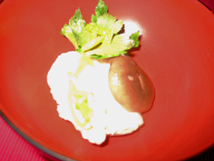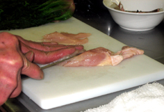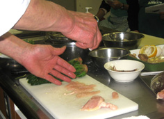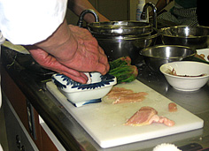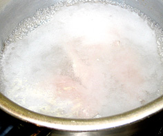 だし汁を合わせて暖め、吸い地を作っておく。その一部を取り分け、茹でた椎茸と鶏肉を入れ、軽く火を通して置いておく。 |