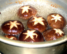 椎茸は石づきを取り、軸を竹串で縦に細かく裂き、笠は包丁目を入れる。これを「くらげ椎茸」と呼ぶ |