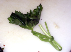 二本の三つ葉の軸を塩で軽くもみ、軟らかくしてから一緒に結び三つ葉にする |