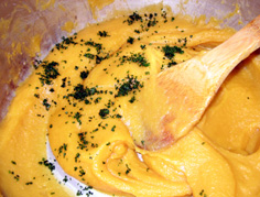 ○木の芽味噌を作って冷ましておく 鍋に西京味噌、みりん、卵黄を入れ、よくまぜてから火にかけ、へらで混ぜながら味噌に火が入るまで弱火で練り上げる。 指を入れて熱く感じる位まで。 この味噌を冷やしてから、みじんに切った木の芽を混ぜ込む |