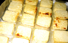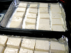 豆腐を8等分に切る。鉄板にアルミホイルを敷き、油を薄く塗って豆腐を並べ、グリルで焼く。 |