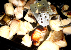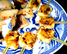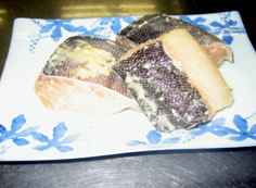 銀たらに薄塩を振り、しばらくおいてから水気を取る。これを西京味噌に2日間漬ける。 味噌を洗ってからグリルで焼き、仕上げにみりんをハケで塗り、さっと焼き上げる |