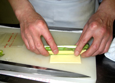棒状のチーズとアスパラをスライスチーズで巻く |