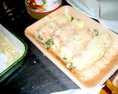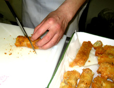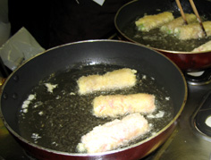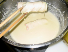 油で揚げたときチーズが溶けないように、卵水と小麦粉をまぜた衣(てんぷらの衣位)を、つなぎにつける |