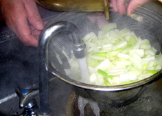 ねぎは沸騰したところに入れ、さっとゆがき、ザルにとる。水に取らずに冷ましておくこと(写真は間違い) ワカメは食べ易く切る |