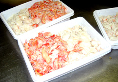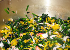 浸し汁を合わせ、カニ、菊、ほうれん草、白ごまを入れて混ぜ、最後にレモンの汁を入れて完成 |