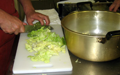 油揚げは湯通ししてから細く切る |