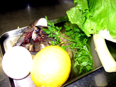 皿にレタスを敷き、海老を盛り、セルフィユを飾る |