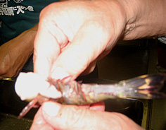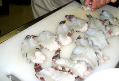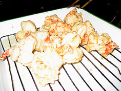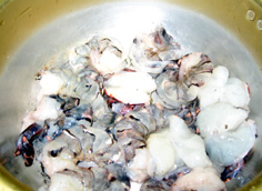 海老は殻をむき塩でもみ、汚れをとってから水洗い。水気をふき取っておく。 |