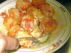 海老に卵白を付け、片栗粉をまぶす。手で海老を軽く握って丸く形を整える |