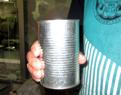 缶詰の空き缶の上下を切り落とし、ラベルをはがす |