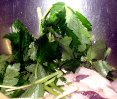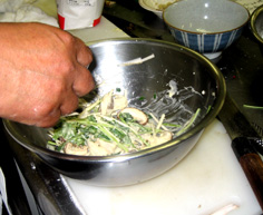 ボールにあなご、椎茸、3cm位に切った三つ葉を合わせておく |