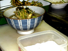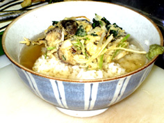 丼にご飯を盛り、天ぷらをのせ塩を少し振り、周りから出し汁を張る。わさびをそえる |