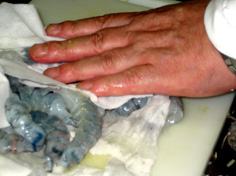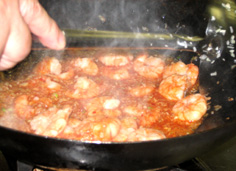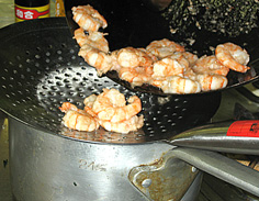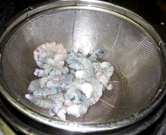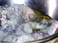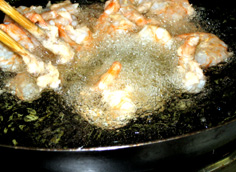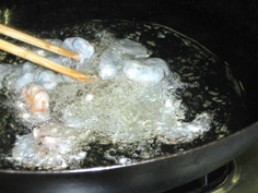 油を多めに入れ、100℃弱くらいのぬるい温度のところで、下味を付けておいた海老を入れる |