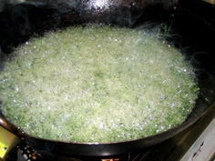 たっぷりの油を沸かす。温度は120℃位。目安は細切りほうれん草を少し入れてみて、パッと散るような状態 |