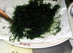 10秒ほどでチリチリになるので、すぐ網で取り出す(ペーパータオルを用意しておき油を取る)長く揚げると焦げる |
