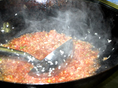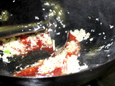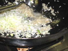 同じ鍋に大さじ2の油を入れ、ねぎ、ショウガ、にんにくを炒める |