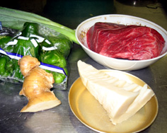 合わせ調味料を用意。牛肉、ピーマン、たけのこ、ネギ・ショウガのみじん切りを並べておく |