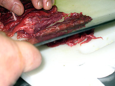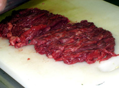 肉を重ねて、端から細く切る。切ったあと、包丁を右に寝かせて肉を倒すようにすると包丁に付いてこない |