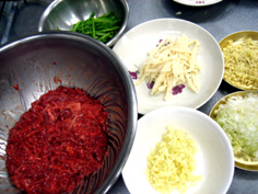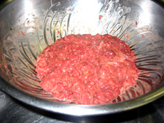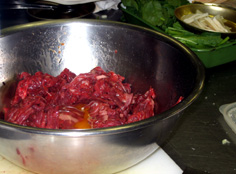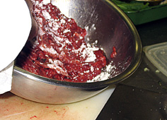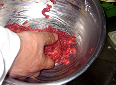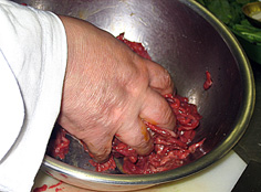 指をこのように広げて混ぜ、良く馴染ませる。肉がちぎれないように加減しながら |