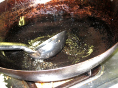 鍋を良く熱し、油を馴染ませてから200〜300ccの油を入れ、約80℃位になったら |
