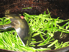 肉に火が通ったら、ここにたけのこを入れ、軽く混ぜる。(写真はピーマンが混じってしまったもの) |