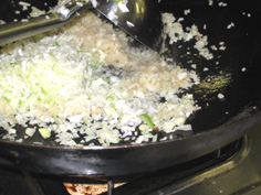 同じ鍋に油少々を足し、ネギとショウガのみじん切りを炒める |