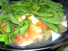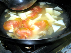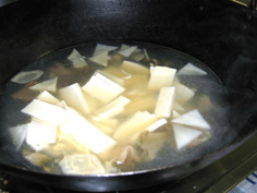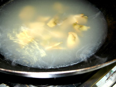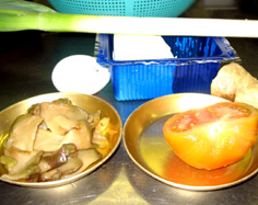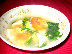 材料 4人分 搾菜(ザーサイ)かたまりで 30g 豆腐(絹) 1/2丁 ほうれん草 2株 トマト 1/2個 ショウガの薄切り 3〜4枚 溶き卵 1個 ※ザーサイは薄く切り、水にさらして適当に塩気を抜いておく スープ 鶏がらスープ 5カップ 調味料 塩・醤油 少々(ザーサイの塩分があるので加減) コショウ・酒 各少々 |