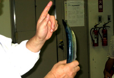 秋刀魚の鮮度の見分け方。目が澄んでいて、くちの先が黄色のもの。尾を持った時、頭の方が30度位にピンと立つもの |